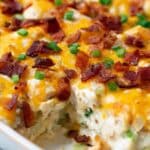 - Add toppings and finish baking: Remove the foil carefully. Sprinkle the top of the casserole evenly with the 2 cups of Mexican Cheese Blend, 1 cup of cooked and crumbled bacon, and 1/2 cup diced green onions. Return the casserole to the oven and bake uncovered for 8-10 minutes, until the cheese is melted and bubbly.