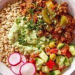 - Assemble and Serve. Divide the warmed cooked whole grains evenly among six serving bowls. Top each with the spiced ground beef mixture. Drizzle some of the prepared harissa oil if using, followed by tahini sauce or creamy feta dressing. Garnish with the tomato-cucumber mix, sliced radishes, fresh cilantro or parsley, and pitted Castelvetrano or kalamata olives. Serve any remaining sauces and toppings on the side for added customization.