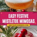 Celebrate the holidays with festive Mistletoe Mimosas, a refreshing cocktail featuring cranberry and apple juice frozen into decorative ice cubes with fresh rosemary, topped with chilled champagne or sparkling apple cider for a delightful twist on a classic mimosa.