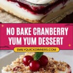 No-bake Cranberry Yum Yum is a delightful and easy-to-make dessert featuring a cinnamon-infused graham cracker crust, a smooth cream cheese and whipped cream filling with vanilla, topped with tangy whole berry cranberry sauce and crunchy chopped pecans. Perfect for any occasion, this elegant dessert requires no baking and offers a beautiful harmony of textures and flavors.