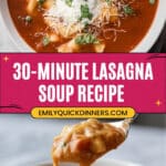 This One Pot 30-Minute Lasagna Soup is a comforting and hearty meal that combines all the flavors of classic lasagna in a flavorful, cheesy soup. Made with ground beef, mushrooms, lasagna noodles, and a rich tomato broth, it’s a quick and easy recipe perfect for weeknight dinners.