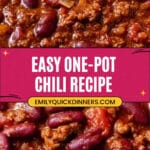 This One-Pot Chili Recipe is a hearty, chunky, and flavorful dish featuring ground beef, kidney beans, tomatoes, and a blend of aromatic spices. Perfect for an easy weeknight meal, it simmers on the stovetop to meld all the rich flavors together, making it a delicious and satisfying comfort food served best with cornbread and your favorite toppings like shredded cheddar cheese and sour cream.