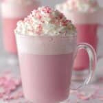 - Serve and garnish: Pour the pink hot chocolate into glasses or mugs. Top with whipped cream and sprinkles if desired for an extra festive touch.
