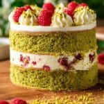 A luscious Pistachio Raspberry Cake featuring moist pistachio-flavored layers, a rich pistachio white chocolate ganache, vibrant raspberry jam, and silky pistachio buttercream. This elegant cake is perfect for celebrations or any occasion requiring a special dessert, combining nutty, fruity, and creamy flavors with a visually stunning green hue and fresh raspberry garnish.