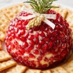 This festive Pomegranate Christmas Cheese Ball is a creamy, tangy, and colorful appetizer perfect for holiday gatherings. Made with a blend of cream cheese, butter, sharp white cheddar, garlic, and green onions, it’s coated in fresh pomegranate arils for a burst of sweetness and a decorative holiday touch. The cheese ball is garnished with a Rolo candy and rosemary to resemble a Christmas ornament, making it visually appealing and delicious served with crackers and veggie slices.