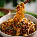A flavorful and quick Potsticker Noodle Bowl featuring wide Lo Mein noodles, ground pork, and a savory sauce with ginger, garlic, and sriracha, tossed together with crunchy coleslaw mix for a satisfying, easy weeknight meal.