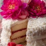 This Raspberry Swirl Coconut Snowball Cake is a luscious, tropical-inspired layered cake featuring moist coconut-flavored cake layers infused with coconut milk and extracts, paired with a smooth coconut cream cheese frosting swirled with vibrant raspberry preserves. Finished with a generous coating of shredded coconut, this cake is a perfect celebration dessert that is visually stunning and rich in coconut flavor with a subtle almond hint.