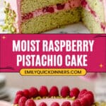 This Raspberry Pistachio Cake features moist pistachio-flavored layers filled with tangy homemade raspberry jam and topped with a vibrant raspberry buttercream. Perfectly balanced between nutty richness and fruity sweetness, this elegant cake is ideal for celebrations or a special treat.