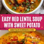 A hearty and wholesome Red Lentil Soup packed with sweet potatoes, carrots, fresh herbs, and brightened with lemon juice. This comforting soup is made with simple pantry staples, fresh vegetables, and aromatic spices, offering a nutritious and flavorful meal perfect for any season.