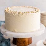 - Assemble the cake: Place one cake layer flat-side up on a cake plate or pedestal. Tuck strips of baking paper under the edges to keep the plate clean. Spread about one-third of the frosting evenly over the layer. Repeat with the second layer, then top with the final layer, flat-side up. Use remaining frosting to ice the top and sides of the cake evenly.