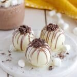 - Decorate: Melt white and milk chocolate separately in the microwave at 15-second intervals until smooth. Stir each well, transfer to separate pastry bags or piping bags, and drizzle artfully over the set cocoa bombs. Sprinkle with your favorite toppings immediately.