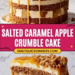For special celebrations, I’ve arranged mini individual cakes using the same components in small tins—it’s a hit for dinner parties! Another idea is to layer the components in a clear trifle bowl, so the gorgeous layers of cake, apple filling, crumble, and frosting are on full display. Either way, this Salted Caramel Apple Crumble Cake Recipe always dazzles.