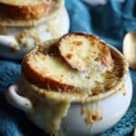 - Add Bread and Cheese: Top each bowl with two slices of sliced French baguette and a generous amount of grated Gruyere cheese along with a sprinkle of grated Parmesan cheese.