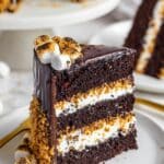 - Finish the cake: Frost the outside with remaining marshmallow frosting for a smooth finish. Press remaining graham cracker crunchies around the bottom edge. Warm leftover ganache and drizzle a chocolate drip over the cake edges. Top with mini marshmallows and use a kitchen torch to toast them. Refrigerate the cake until serving. Store leftovers in an airtight container and consume within 3-4 days, serving cool but not cold.