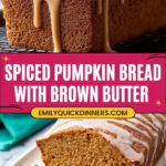 This Pumpkin Bread with Salted Brown Butter Glaze is a richly spiced quick bread that combines the warm flavors of cinnamon, allspice, and nutmeg with moist pumpkin purée. The loaf is baked to a golden brown and topped with a luxurious glaze made from browned butter, powdered sugar, and a hint of cinnamon and vanilla, adding a deliciously nutty, sweet finish that makes this treat perfect for fall and holiday gatherings.