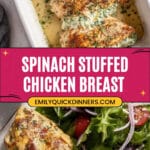 This Spinach Stuffed Chicken Breast Bake Recipe freezes beautifully. Wrap each stuffed breast tightly in plastic wrap, then foil, and freeze for up to 2 months. When you’re ready, thaw overnight in the fridge before baking as usual. It’s a lifesaver for busy weeks.