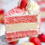 - Garnish and Serve: Before slicing, garnish cake with fresh whipped cream and fresh strawberries as desired. Slice carefully and serve chilled.