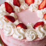 - Making the Strawberry Whipped Cream: Cream together softened cream cheese, melted white chocolate, sugar, and strawberry extract until smooth. Slowly add chilled heavy cream and whip until stiff and fluffy. Transfer the cream into a piping bag fitted with a decorative tip. Pipe the whipped cream over the mousse layer, fully covering it. Chill the assembled cake overnight to set the mousse and whipped cream layers completely.