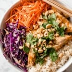 - Assemble the Bowls: Layer cooked rice at the base of each bowl, top generously with sliced chicken breasts, shredded cabbage, shredded carrots, chopped cilantro, and optional chopped peanuts. Drizzle the peanut sauce over everything just before serving for a delicious finishing touch.