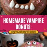 These Vampire Donuts are a fun and spooky treat perfect for Halloween. Soft, fluffy yeast donuts are fried to golden perfection, then dipped in a chocolate glaze and decorated with candy eyes, fall leaf sprinkles, and funfetti for a festive touch. The addition of playful vampire fangs makes these donuts an entertaining centerpiece for any Halloween celebration.