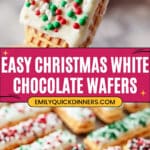Celebrate the festive season with these delightful Christmas White Chocolate-Dipped Sugar Wafers. Crisp sugar wafer cookies are partially dipped in creamy white chocolate coating and adorned with vibrant red, green, and white sprinkles, making them perfect for holiday gatherings or gifting. Easy to prepare and irresistibly charming, these treats bring a sweet and colorful touch to your Christmas dessert table.