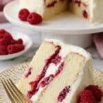 A decadent and moist White Chocolate Raspberry Cake featuring a delicate vanilla-flavored whipped ganache frosting and a fresh raspberry filling. This layered cake combines the tartness of raspberries with the luxurious creaminess of white chocolate, perfect for celebrations or indulgent dessert moments.